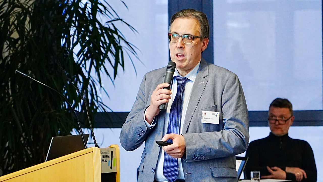 Im zweiten Vortrag widmete sich Oberarzt Dr. Thomas Stache einem Thema, das jährlich Millionen Menschen betrifft – und allein im Klinikum Dessau mehr als 700 Patienten: dem Schlaganfall.